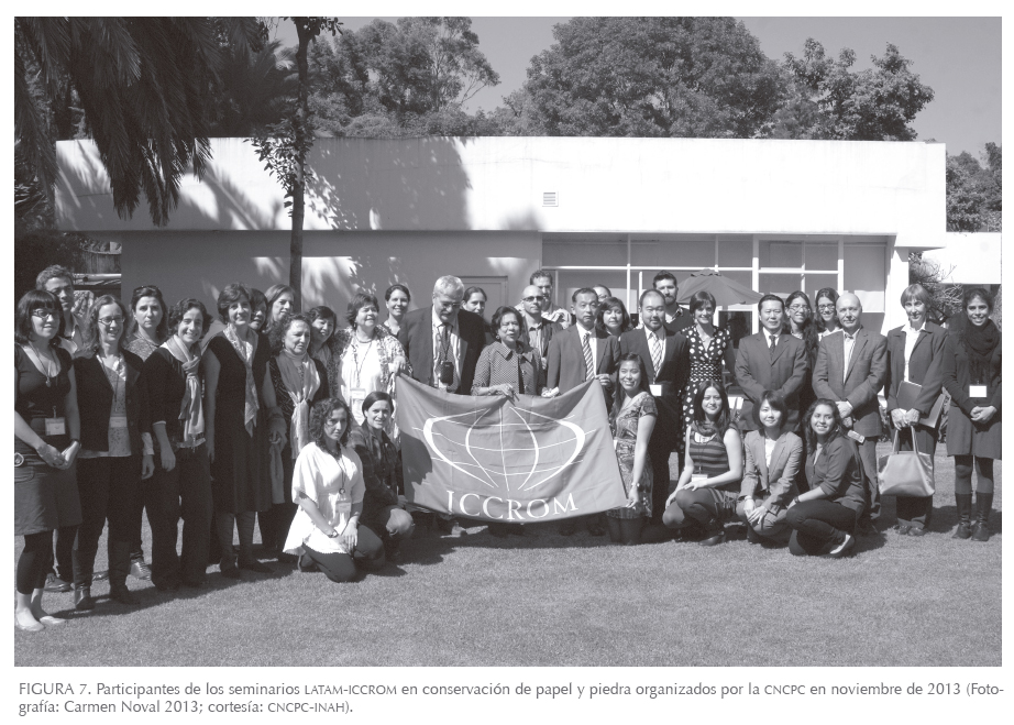 Con esta línea de acción, en su totalidad referida tanto al país como al extranjero, lo que se propone es consolidar las labores de actualización y formación de los restauradores del INAH, así como apoyar las tareas académicas, de reflexión y educación en torno de la conservación. De esta manera, con la finalidad de estrechar la relación de los distintos agentes que se vinculan y usan el patrimonio, se promueve el análisis e intercambio en dos vías: por un lado, mediante la difusión de las labores y los estudios que se llevan a cabo insistimos, en cualquier lugar del mundo y, por el otro, por medio de la organización de cursos, talleres y foros de discusión con especialistas. Para alcanzar esta meta, permanentemente se proponen convenios y acuerdos con escuelas y centros de investigación y de trabajo, entre los que han destacado los seminarios en materia de conservación de piedra y papel realizados en el marco de la iniciativa de colaboración con el Programa para la Conservación del Patrimonio Cultural en América Latina y el Caribe (LATAM) del International Centre for the Study of the Preservation and Restoration of Cultural Property (ICCROM) (Figura 7).