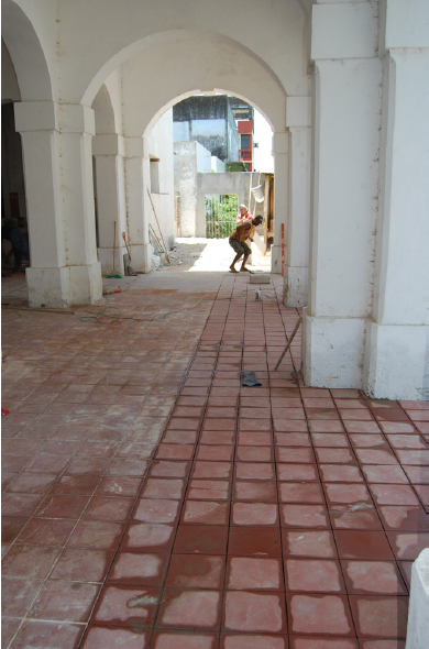 Otra de las intervenciones de gran impacto para el conjunto fue la integración de pavimentos, que habían tenido diferentes acabados a lo largo de las múltiples adaptaciones del inmueble. En el anterior proyecto de adecuación se había previsto integrarlos con losetas de barro extruido de 20 x 20 cm, similares a algunos restos históricos localizados en habitaciones de la planta alta. No obstante, en el rediseño de la propuesta se decidió mandar a hacer a Mérida, Yucatán, México, losetas artesanales "de pasta" de color rojo óxido (Figura 11), con base en el supuesto de que el flujo de visitantes a un museo desgastaría en muy poco tiempo los acabados cerámicos.