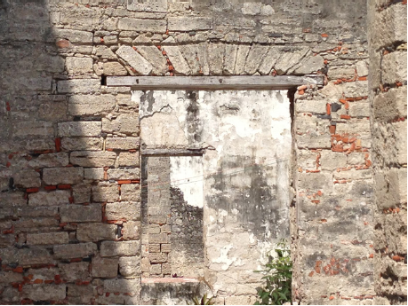 Figura 2 Los bloques de conchuela de muros y platabandas quedaron expuestos a la intemperie al perderse paulatinamente los recubrimientos originales de cal y arena (Fotografía: Luis Fernando Guerrero, 2015).
