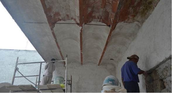 Figura 8 Aplicación de aplanados en muros y bajo las bóvedas catalanas (Fotografía: Geiser Gerardo Martín, 2015).