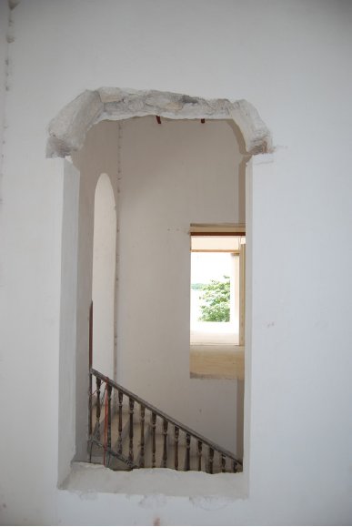 En una ventana de la planta alta que comunicaba una habitación con el cubo de la escalera monumental, el puntal de apoyo de la platabanda se desprendió una vez que se había retirado el dintel de madera, lo que provocó que el relleno se derrumbara hasta la planta baja. Se realizaron calas en los aplanados con el propósito de perfilar las dovelas, y se descubrió que no se trataba de un marco horizontal, como el de la mayoría de los vanos del edificio, sino de un arco de medio punto perfectamente trazado, correspondiente a la primera etapa constructiva del edificio. La supuesta platabanda de descarga del dintel no era, en realidad, sino un "tapón" colocado, probablemente a principios del siglo XX, a manera de tímpano (Figura 10).