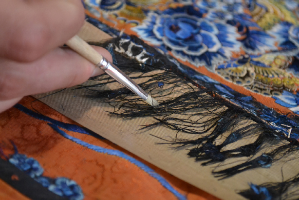 Adicionalmente, las roturas del hilo de papel metalizado se intervinieron, primero, adhiriendo los hilos con la preparación de funori-sorbitol 1:1 (en una mezcla de mayor viscosidad para reducir la humectación excesiva del papel), y luego, cosiendo nuevamente los entramados al soporte original (Abdó Labarthe et al. 2013:95-96).