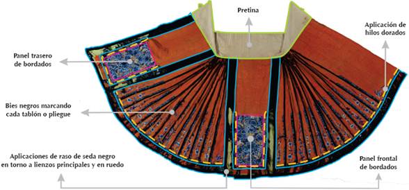 Figura 2 Esquema de las secciones que conforman la falda (Esquema: Citlalli Itzel Espíndola Villanueva, 2015; cortesía: STCRT, ENCRyM-INAH).