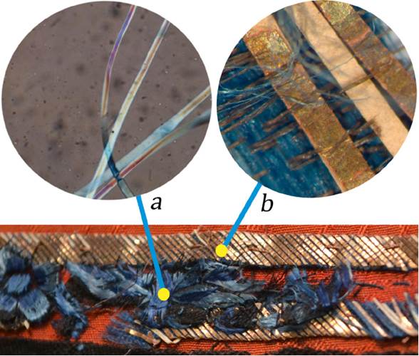 Figura 4 Detalles de ornamento de la falda: a) Hilos azules de bordado, 40x. b) Hilos de papel metalizado, 35x (Esquema: Citlalli Itzel Espíndola Villanueva, 2015; cortesía: STCRT, Laboratorio de Biología y Laboratorio de Enseñanza, ENCRyM-INAH).