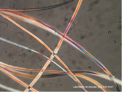 Figura 5 Hilos de seda (Bombyx mori) del damasco naranja; observación en microscopio óptico, 40x (Fotografía: Laboratorio de Biología ENCRyM-INAH, 2013; cortesía: STCRT, ENCRyM-INAH).