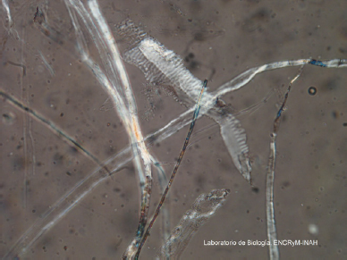 Figura 6 Fibras de pulpa de madera de angiosperma de los hilos de papel metalizado; observación en microscopio óptico, 40x (Fotografía: Laboratorio de Biología ENCRyM-INAH, 2013; cortesía STCRT, ENCRyM-INAH).