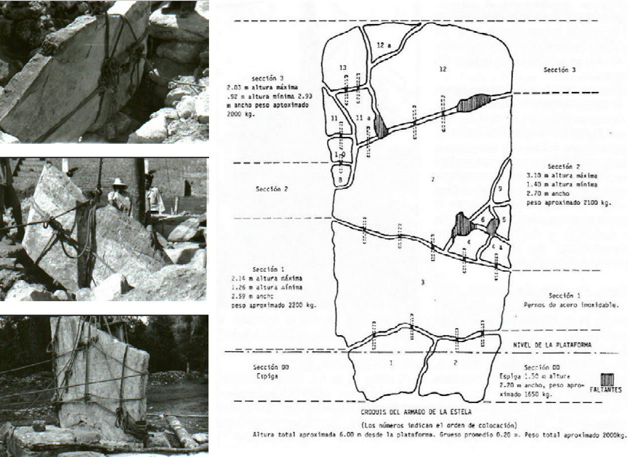 En la zona arqueológica de Bonampak, Chiapas, Montero participó, entre 1967 y 1977, en la elaboración de los estudios para la restauración de las pinturas del edificio 1 (Montero 1985) y, por supuesto, dirigió la majestuosa restauración de la Estela 1 (Figuras 11 y 12), acciones realizadas en condiciones extremas de aislamiento, gracias a la coordinación precisa de un grupo de técnicos de campo y al empleo de técnicas tradicionales de elevación de peso (Montero 1977, 1994).