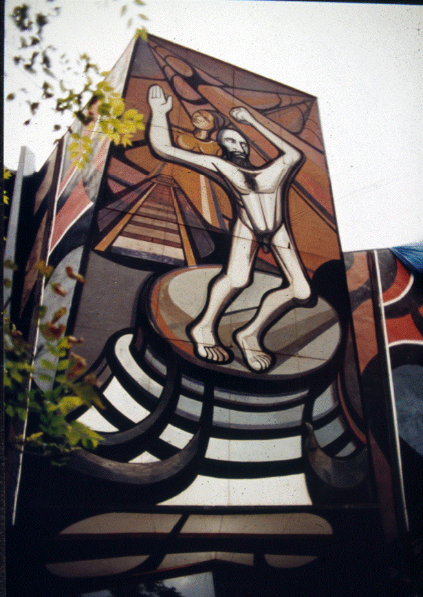 Figura 17 Vista del Panel exterior no. 10. Mestizaje: el drama de la guerra y el amor durante la conquista, realizado por David Alfaro Siqueiros y restaurado por Sergio Arturo Montero Alarcón, 1994-1995.