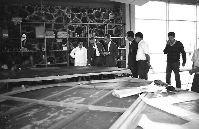 Figura 2 Restaurador Sergio Arturo Motero Alarcón (A y B, él en camisa a cuadros) trabajando en el desprendimiento de los murales de Cecil Crawford O’Gorman