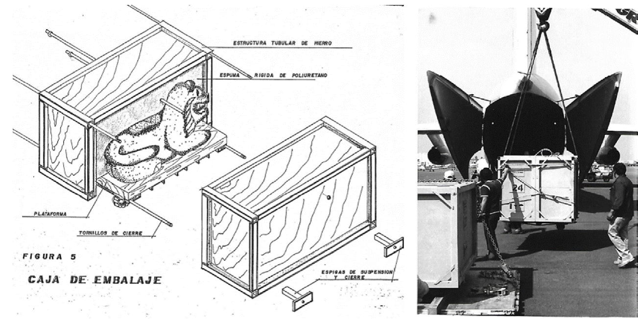 Figura 9 Isométrico de la caja de embalaje para traslado del Ocelotl Cuauhxicalli diseñado por Sergio Arturo Montero Alarcón (izquierda). Embalaje del Ocelotl Cuauhxicalli volado para colocarlo al interior del avión que lo llevaría a Washington D.C, Estados Unidos (derecha).
