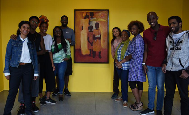 Figura 2 Algunos participantes en el proceso curatorial de La consentida es: La familia negra, alrededor de la obra del Maestro Rodrigo Barrientos, de izquierda a derecha: Liliana Angulo Cortés, Geanny Asprilla, Manuela Córdoba, Connie Mena, David Cabezas, Edith Gonzáles, Doña Deyanira Valdés, Yasira Vanessa Borja, William Murillo y Aimer Ruiz.