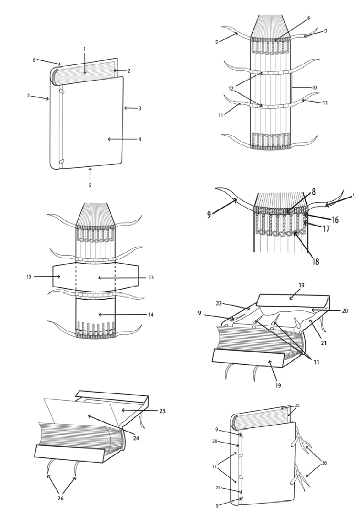 Figura 3 Elementos de la encuadernación en pergamino flexible: 1. Canto de cabeza, 2. Canto de frente, 3. Frente, 4. Tapa anterior, 5. Pie, 6. Cabeza, 7. Lomo, 8. Cabezada, 9. Prolongaciones del alma de la cabezada, 10. Compartimento, 11. Prolongaciones de los soportes de costura, 12. Soportes de costura, 13. Endose, 14. Prolongaciones del endose transversal, 15. Endose en compartimento, 16. Nudo posterior de la cabezada, 17. Ancla de la cabeza, 18. Cadeneta (costura), 19. Extensión de cubierta, 20. Vuelta de frente, 21. Vuelta de pie, 22. Vuelta de cabeza, 23. Contraguarda, 24. Guarda, 25. Cajas de cabeza y frente, 26. Lazos (cierres), 27. Pleca de doblez, 28. Pleca del lomo.
