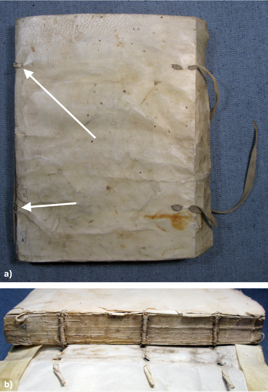 Figura 4 a) Prolongaciones de los soportes de costura que unen la cubierta de pergamino con el cuerpo del libro. b) Prolongaciones de los soportes de costura al interior de la tapa. Martín de Azpilcueta (1575).