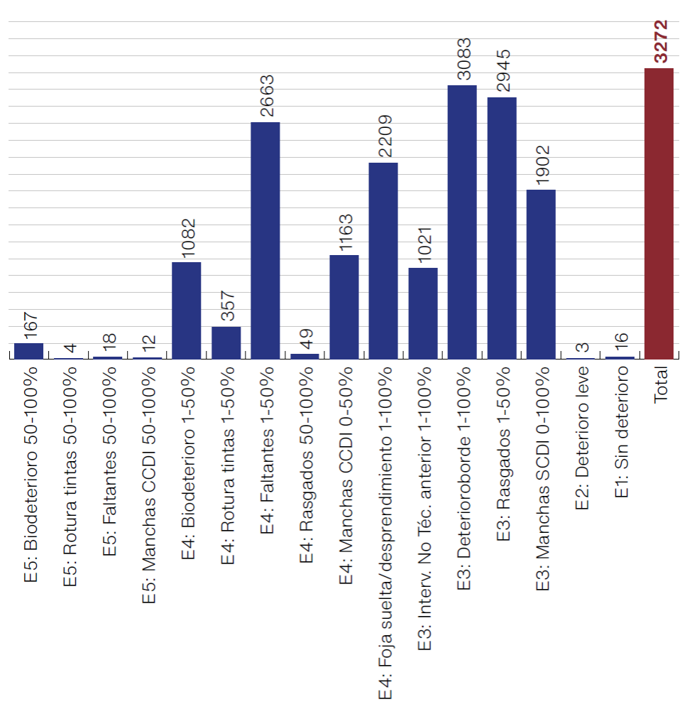 La mayor concentración de deterioros, en diversos grados, se encuentra en el estado 4 y 3, lo que representa una condición de moderado a alto riesgo respecto de la pérdida de información. Los 3 deterioros más significativos encontrados son: