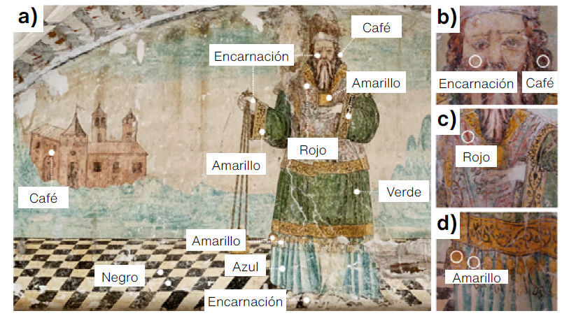 El análisis de la obra fue un trabajo interdisciplinario, que contó con la participación de especialistas en restauración, química y ciencia de materiales (Arciniega-Corona et al., 2020). La investigación se abordó de la siguiente forma: se decidió hacer, a través de la observación directa de la pintura mural y con microscopia óptica digital (MOD), un estudio de los colores presentes en la paleta cromática, identificando primero las zonas de donde aquéllos se pudieran obtener de manera más pura y saturada (sin mezclar o diluir). Para los amarillos se decidió examinar los que se localizan en las granadas y campanillas de los bordes de la túnica (Figura 3d), las mangas del efod y el pectoral (Figura 3a). El color verde se eligió de la túnica (Figura 3a); el rojo, del efod (Figura 3c); el azul, del vestido (Figura 3a); los cafés, del cabello del personaje y del castillo del fondo de la imagen (Figura 3 b y 3c); las encarnaciones, del rostro, pies y manos (Figura 3a y 3b), y el negro, de los cuadros del suelo (Figura 3a).
