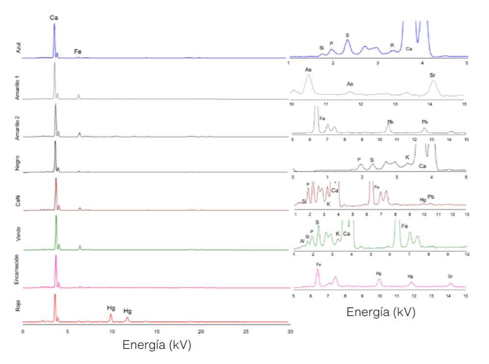 La Figura 5 registra los espectros asociados con cada color de la paleta pictórica; con base en la identificación elemental, se relaciona la presencia de los pigmentos empleados en la época (Trentelman et. al., 2012). De manera general, el calcio (Ca) es un elemento que se encuentra en todas las mediciones, además de ser el pico más intenso, lo cual puede estar relacionado con la presencia del carbonato de calcio (CaCO3) de la base de preparación así como con los restos de la capa de cal retirada durante la liberación. Por esa razón, el calcio no se puede considerar como un elemento indicador para la identificación de pigmentos.