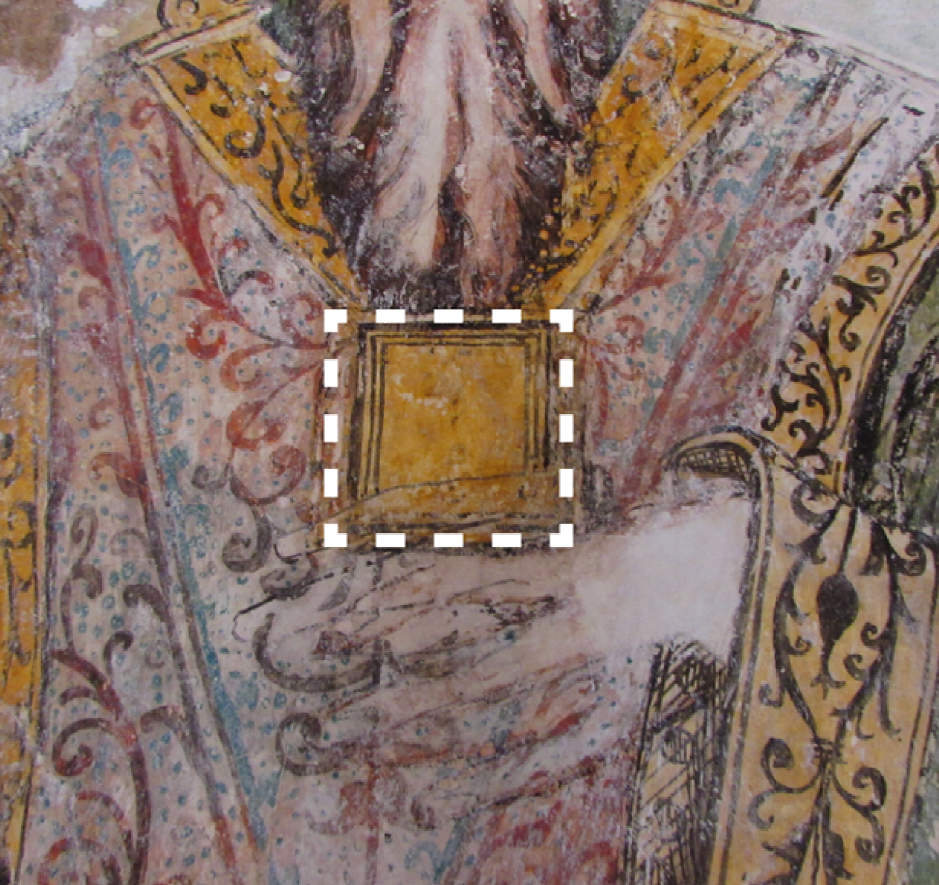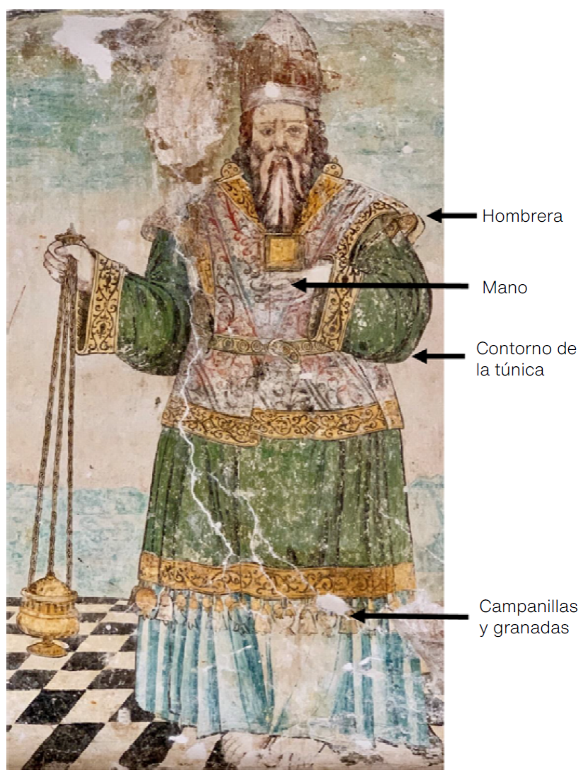 El resultado fue la recuperación de una imagen religiosa que es de la misma temporalidad que la del luneto inmediato (sobre el muro norte), con lo que se recuperó la lectura discursiva de ambos espacios. En la imagen vemos representado a un personaje masculino barbado que se encuentra de pie, ricamente ataviado, a semejanza de un sacerdote judío: porta sobre un vestido azul una túnica verde con granadas y campanillas de color amarillo-dorado en la orla; sobre ésta, un efod con motivos fitomorfos en rojo, azul y negro, y en su cabeza, una mitra. El personaje está descalzo sobre un piso de damero (Figura 2b); en la mano derecha sostiene un incensario y en la derecha, a la altura del pecho, un elemento rectangular que, suponemos, se trata de un pectoral. El fondo de la imagen es de color azul claro y a los lados, entre árboles de copas oblongas, se aprecian dos edificios que semejan castillos o conventos. Se considera que la técnica pictórica es un temple, debido a la saturación y la sobreposición de colores, el brillo de la capa pictórica así como la carencia de marcas que nos indiquen la aplicación de los enlucidos por tareas.