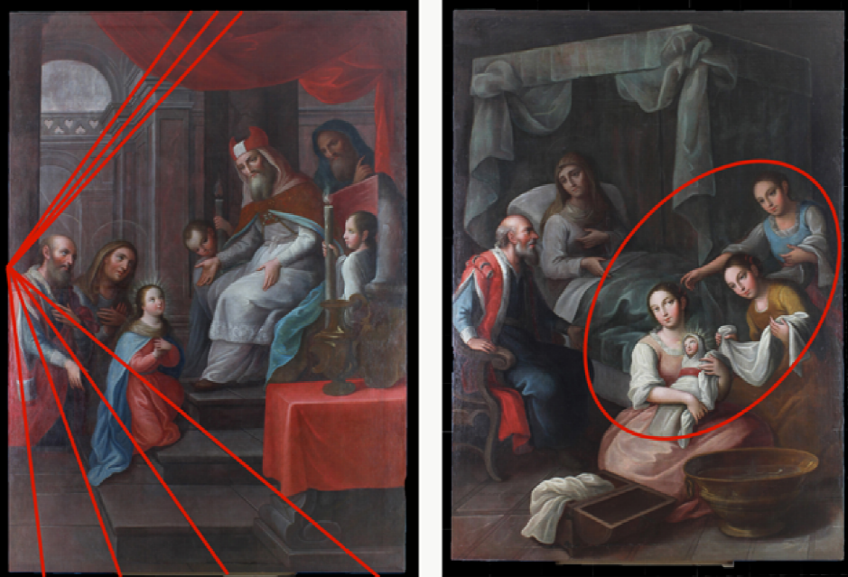 En el segundo caso se apreció la diferencia de iluminación para delimitar distintos planos. En la escena de El nacimiento de la Virgen, los personajes en primer plano se encuentran mucho más iluminados y, conforme se avanza dentro de la habitación, la luz disminuye. Mediante esos cambios, se identifican los planos y, además, se establece un recorrido visual que permite determinar a los personajes principales y el tema central de la obra (Figura 3).