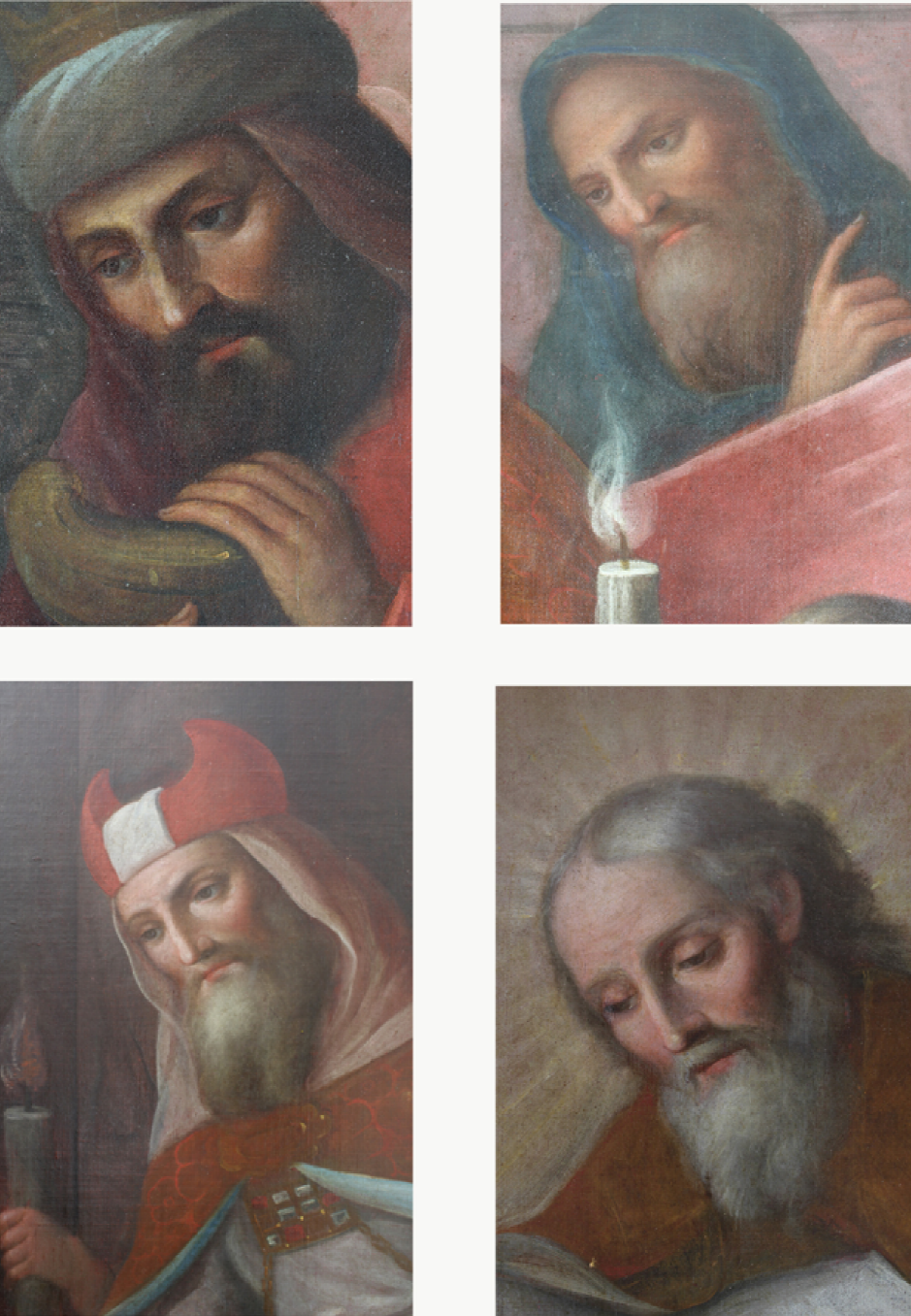 Además, se identificó la repetición de patrones y personajes dentro de la misma serie (Figura 4). Páez debió contar tanto con un gran taller y bastantes ayudantes como de astucias con las que pudo incrementar su producción sin restarle calidad. Sería importante dilucidar si ese tipo de patrones fueron plantillas y cómo se traspasaron a la pintura. Esos rostros seguramente fueron trabajados y seleccionados cuidadosamente por el artista para usarlos constantemente, como se ve en las soluciones visuales de los cuatro personajes incluidos en la Figura 4, que corresponden, de izquierda a derecha y de arriba hacia abajo, a las escenas: La adoración de los Reyes (rostro 1), La presentación de la Virgen (rostros 2 y 3) y La coronación de la Virgen (rostro 4).