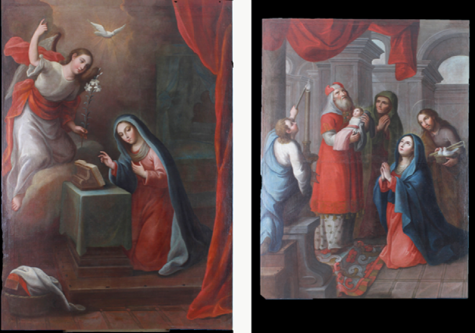 Figura. 9 Páez recurre a los rojos en sus composiciones para aprovechar la base de preparación en cortinajes y manteles de La anunciación y La presentación del Niño.