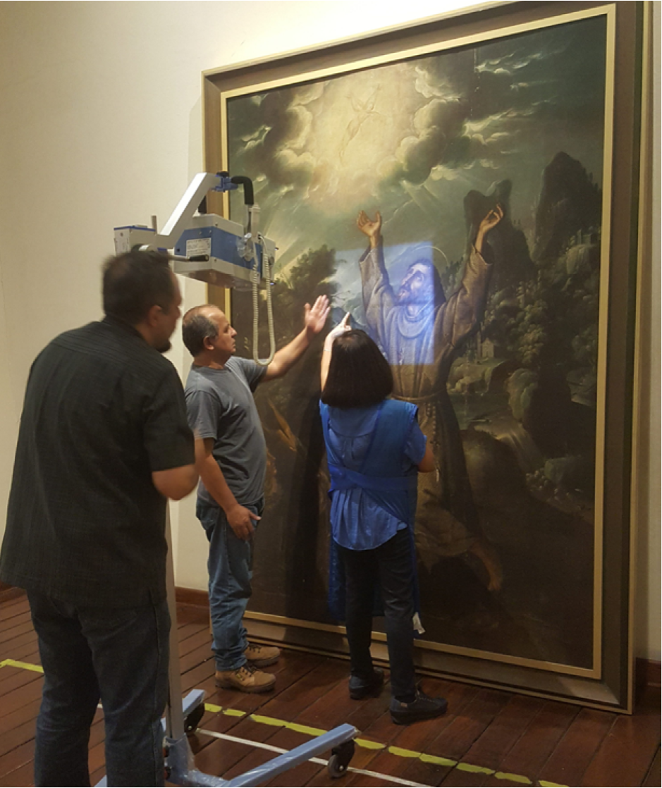 Sobre la pintura que forma parte de la pinacoteca del otrora Museo de Bellas Artes de Jalisco, hoy MRG, fundado en 1918, cabe mencionar que no se había puesto bajo la metodología de análisis que se plantea en este INFORME ACADÉMICO, dadas las circunstancias sociales por las que atravesó el país, las cuales influyeron en las políticas culturales de aquel museo, en aquellos años, preocupado por tomar acciones que salvaguardaran su permanencia como institución cultural (Cruz-Lara, 2017, pp. 18-31). Sin embargo, una de esas acciones es de interés nuestro, porque incidió directamente en la materialidad de la pintura: la reestructuración de 1975, promovida por el director en turno, José Guadalupe Zuno, financiada con recursos federales otorgados por el presidente Luis Echeverría Álvarez (Sánchez, 2015, p. 29-32). Con ese acontecimiento, la pintura fue intervenida por los especialistas del Departamento de Restauración del Patrimonio Cultural del INAH (Oropeza, 1975), actual Coordinación Nacional de Conservación del Patrimonio Cultural (CNCPC, México). En entrevista, el restaurador Manuel Serrano †, quien entre 1975 y 1976 dirigió la restauración de esa pintura (Figura 1), comentó que, dada la presión en la fecha de entrega de la obra por parte del señor Zuno, y a causa de la falta de equipos científicos (M. Serrano, comunicación personal, 6 de julio de 2018), los restauradores no pudieron ejecutar más análisis para caracterizar su materia constitutiva; sin embargo, se mostraron interesados en hacer estudios previos a la restauración, y en La estigmatización de san Francisco de Asís lograron una acertada descripción iconográfica, además de que tomaron fotografías con luz IR y luz UV, a cargo de la fotógrafa Irmgard Groth, lo que era un avance tecnológico de gran importancia para su momento (Serrano et al., 1976). Esos resultados iban acordes con la formación profesional que recibieron los primeros restauradores mexicanos, impartida por George Messens y Sheldon y Caroline Keck cuando, en 1965, participaron en la fundación del Centro Regional Latinoamericano de Estudios para la Conservación y Restauración del Patrimonio Cultural (Cerlacor) promovida principalmente por Coremans y Castillo Negrete, actual CNCPC, en la Ciudad de México (Giorguli, 2014, pp. 74-87; López, 2014, pp. 100-119). Desde una interpretación teórica y práctica, este INFORME ACADÉMICO aporta, a los estudios que han centrado sus esfuerzos en investigar esa obra, una fuente de conocimiento para la conservación-restauración y áreas afines.