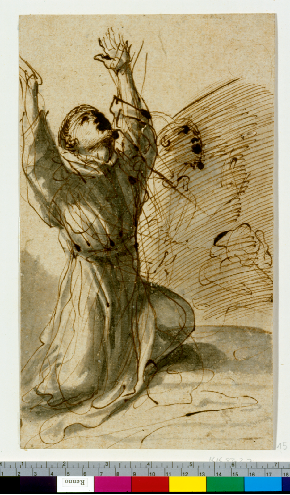 Figura 5 Giovanni Francesco Barbieri "Il Guercino" (1591-1666). (c. 1640-50). Der hl. Franziskus. Pluma y tinta en marrón, pincel en gris. Obsérvese la estudiada expresión extasiada del rostro de san Francisco de Asís, y la gracia con la que el Guercino hizo al santo con los brazos levantados, para enfatizar el sentimiento religioso de la implantación de los estigmas, así como lo vemos en el ejemplar novohispano.