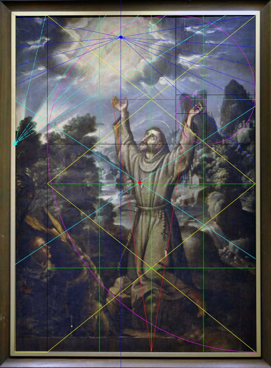 Figura 7 Análisis de los trazos compositivos en La estigmatización de san Francisco de Asís, para encontrar la sección áurea.