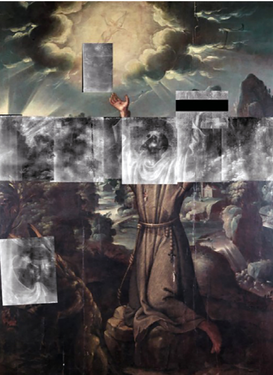 3) Análisis radiológico digital: por los fundamentos de los conceptos geométricos clásicos reutilizados por Pacioli (1509) en De divina proportione -ilustrado por da Vinci- con el fin de representar las ideas de forma clara y armónica mediante el uso de la proporción divina (Wade, 2017, pp. 76-81), se retomaron los resultados de los estudios realizados en la pintura de La Annunciazione de da Vinci, en la cual se encontró una red triangular, lo que sugiere el modo de transferir el dibujo del cartón a la imprimatura (Dunkerton, 2011, pp. 4-31); también se consideraron importantes los resultados radiográficos de El martirio de san Ponciano, por ser una obra con firma de Baltasar de Echave Orio -que se resguarda en el Museo Nacional de Arte del Instituto Nacional de Bellas Artes y Literatura (INBAL)-, en los que se mencionaron unas incisiones diagonales que se interpretaron como un rayado hecho en el soporte de madera para asegurar el anclaje del enlenzado (Cuadriello et al., 2018, p. 104), primera capa que señala la tratadística de pintura europea en la manufactura de una pintura sobre tabla. Si encontráramos alguna retícula geométrica similar en La estigmatización de san Francisco de Asís, se reafirmaría nuestra hipótesis sobre la importancia que Baltasar de Echave Orio y su taller dieron al análisis compositivo, al dibujo y a la divina proporción.