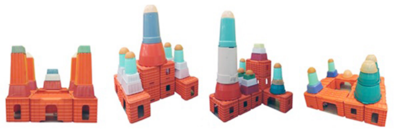La obra Famosos edificios históricos mexicanos (I, II, III y s/n) fue realizada por el artista estadounidense Dennis Oppenheim4 mediante la ensambladura de utensilios de plástico de uso cotidiano, que a su vez conforman cuatro estructuras o conjuntos, acompañadas de una instalación eléctrica debajo de la base de cada uno para iluminar la pieza. Dichas ensambladuras representan estructuras arquitectónicas mexicanas (Figura 12) (Jiménez, 2015, p. 3).