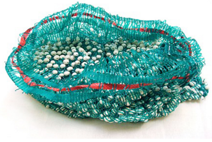 En particular, el interés de la artista Emilia Sandoval3 por trabajar con plásticos así como con su combinación con otros materiales surgió de varias experiencias previas. Su primer acercamiento fue al llegar al estado de Oaxaca, al taller del ceramista Adrián Paredes, donde, inspirada en la variedad de los mercados de la ciudad y de sus alrededores, comenzó a experimentar y combinar materiales. De ahí nació la serie Formas contenidas (2006). Así, coció barro de alta temperatura sobre costales o arpillas de plástico que se utilizan en los mercados, por lo que, a partir de dichos materiales y de la oposición de elementos y conceptos, genera su discurso: barro vs. plástico y modernidad vs. tradición (E. Sandoval, comunicación personal, 2 de abril, 2015).