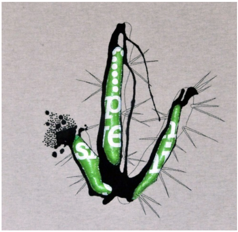 El empleo del plástico culminó con la elaboración de la serie Botánica: nuevas especies, conjunto de piezas realizadas de 2009 a 2011, entre las que se encuentra Tasajo Norstrom. Como indica Jiménez, fueron elaboradas con bolsas de plástico (lo que conlleva la reutilización de un material producido industrialmente, cuyo uso inicial es mercantil, ya que sirven como contenedores de productos comerciales de distintas marcas), en combinación con otros materiales, como madera de pino como estructura del bastidor, tela de lino como soporte y pintura acrílica, chaquira e hilo de algodón como elementos decorativos. Para ello la artista llevó a cabo un procedimiento manual y artesanal -una serie de pasos que conforman el proceso creativo de la obra-, cuya técnica artística se caracteriza por la minuciosidad y la paciencia (Figura 8) (2015, p. 52).