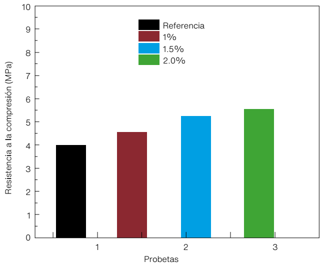 En la Figura 10 se exponen los resultados obtenidos del ensayo de resistencia a la compresión de los especímenes sin y con adiciones de goma de nopal después de 28 días de secado (curado). Se observa un incremento de la resistencia a la compresión conforme aumenta el contenido de goma de nopal, con porcentajes de 12.5% con 1% de goma, 20% con 1.5% de goma y 25% con 2% de goma, comparados con la resistencia del espécimen de referencia. Como puede advertirse, los especímenes de tierra adicionados con 2% en peso de goma mostraron los valores de mayor resistencia a la compresión, lo que indica que a mayor cantidad de goma en la mezcla de tierra, se favorecen las propiedades mecánicas. La presencia de los polisacáridos contenidos en la goma de nopal Opuntia ficus en la mezcla de las tierras induce la adhesión entre las partículas de la tierra, como ya se había mencionado anteriormente, en la Figura 7; la lenta disminución en la pérdida de humedad de los especímenes de tierra, además de apoyar la trabajabilidad, causa un secado lento, el cual evita la pérdida abrupta de humedad y propicia una adecuada cohesión de los materiales. Chang et al. (2016) mencionan que la presencia de las gomas ayuda a la aglomeración entre las partículas de las tierras por medio de una cohesión inducida derivada de la presencia del hidrogel, que varía con las condiciones de humedad de la mezcla.