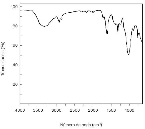 La Figura 5 muestra el espectro de FTIR de la goma de nopal, donde se aprecian las bandas características de los grupos funcionales presentes: las localizadas entre 3 470 y 3 130 cm-1 corresponden a la vibración de los grupos hidroxilo (-OH); estas vibraciones se atribuyen al enlace de hidrógeno presente en los alcoholes y el ácido carboxílico; la posición en 2 929 cm-1 se atribuye al estiramiento de los enlaces -CH presentes en la piranosa y en el glucósido -COCH2 (Gheribi et al., 2018, p. 208). Las bandas ubicadas a 1 730 cm-1 y 1 620 cm-1 se asocian con el grupo carbonilo (C=O), y la banda en 1 425 cm-1 está relacionada con la vibración simétrica del grupo (COO-), presente en la estructura de la goma, grupos funcionales atribuidos a la presencia de monosacáridos y residuos del ácido. Por último, las bandas entre 900 y 1 200 cm-1 se atribuyen a la región conocida como la huella de los polisacáridos (Razavi et al., 2014, p. 460).