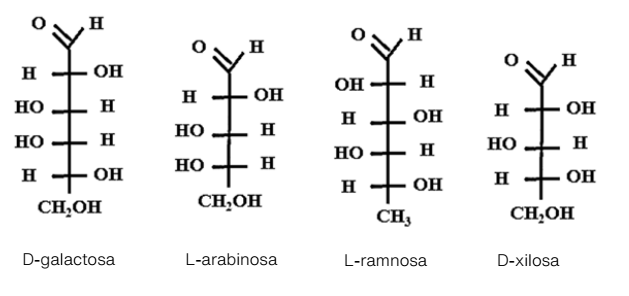 La presencia de estos grupos funcionales en la goma de nopal corrobora que su composición química está basada principalmente en azúcares compuestos por monosacáridos -los cuales pueden ser muy similares o iguales a los reportados en el mucílago del nopal-, como son la galactosa, la arabinosa, la xilosa, la ramnosa de diferente estructura (Figura 6), mencionados en el párrafo anterior. Es importante mencionar que existe poca información acerca de la composición química de la goma de nopal, sin embargo, dado su origen, es muy probable que su composición sea muy similar a la del mucílago de nopal.