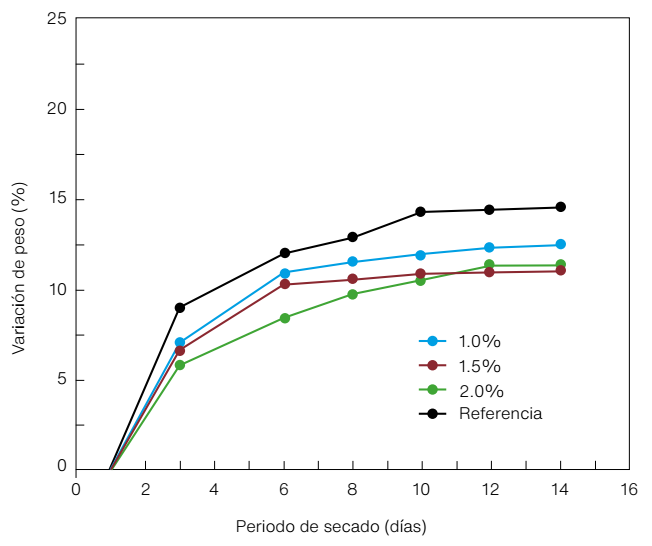En la Figura 7 se aprecia la pérdida de peso durante el proceso de secado de los especímenes de tierra sin y con goma de nopal: véase que, al tercer día de secado, la pérdida de humedad en el espécimen de referencia es de 9%, mientras que los especímenes de tierra con goma de nopal perdieron aproximadamente 6.5%. A los seis días, los especímenes de tierra con goma experimentaron una pérdida de humedad entre 8% y 10%; cabe mencionar que el espécimen que tiene un porcentaje mayor de goma (2%) presenta el valor más bajo de pérdida de humedad, mientras que el espécimen de referencia mostró una pérdida de 12%. A los 10 días del ensayo, los especímenes con goma pierden entre 10% y 12% de humedad, mientras que el espécimen de referencia alcanza una pérdida de 14.5%. Estas diferencias entre los especímenes de referencia y los que tienen goma continúan así hasta alcanzar los 14 días, fecha en que las pérdidas tienden a ser constantes. Ese comportamiento se puede atribuir a la composición química de la goma, ya que, al ser un polímero de alto peso molecular, crea redes de gel internas en las que se retiene el agua y, por lo tanto, se ve reducido su transporte al exterior (Khachatoorian et al., 2003, p. 20). Esa ligera retención de humedad, favorecida por la goma de nopal presente en los especímenes, en los primeros días hace más lento el proceso de secado, lo que podría propiciar menor formación de grietas durante ese proceso. Además, aumenta la plasticidad de la pasta, facilitando la aplicación en forma de capas durante los procesos de reposición de faltantes, acabados superficiales, rellenos, etcétera.