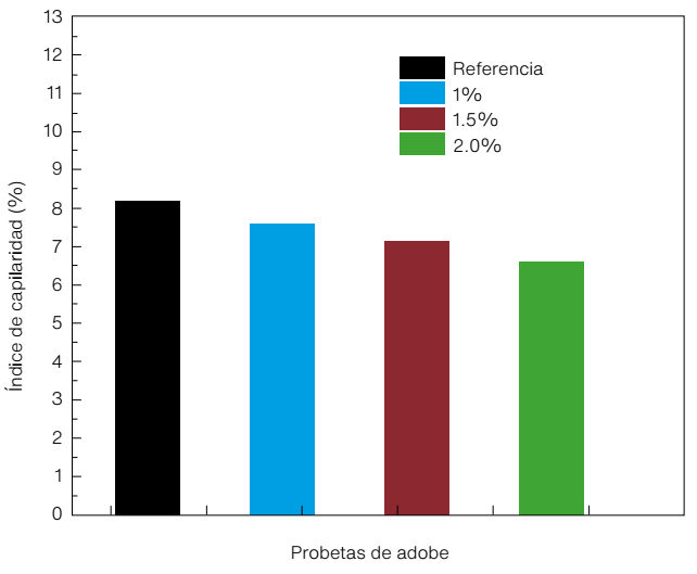La presencia de la goma de nopal en los especímenes de tierra mostró una disminución del índice de capilaridad; a mayor contenido de goma de nopal, menor índice de capilaridad y, por lo tanto, menor absorción de humedad por parte de los especímenes estudiados. La presencia de la goma condujo, conforme aumentaba el porcentaje de ésta, a una menor disgregación de las partículas de tierra durante el ensayo.