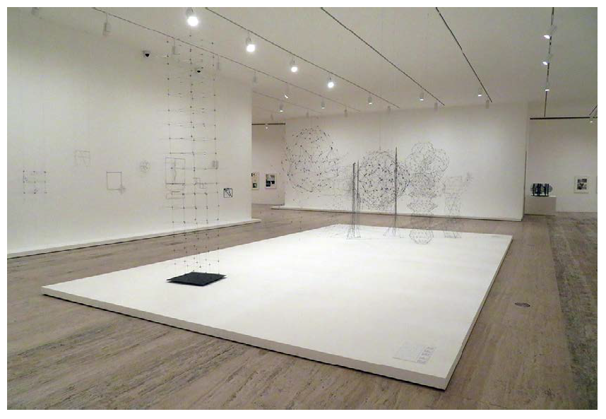 Para la instalación de esa obra en la sede de destino siempre tenemos que dar instrucciones previas. En este caso, como la Reticulárea cuadrada no tiene un peso elevado, no es necesario reforzar techos para instalarla, siempre y cuando éstos ofrezcan garantías de soportar de 50 a 100 kg. En el Museo Jumex se hicieron agujeros en el techo de placa de yeso laminado y se pusieron unos ganchos (“angelitos”) para después poder pasar los hilos de náilon. Al estar sujeta al techo en cuatro puntos, la mejor opción para nivelar la obra es poner algún tipo de stopper tocando el techo, para conseguir una posición horizontal perfecta en esos puntos de sujeción (Figura 3).