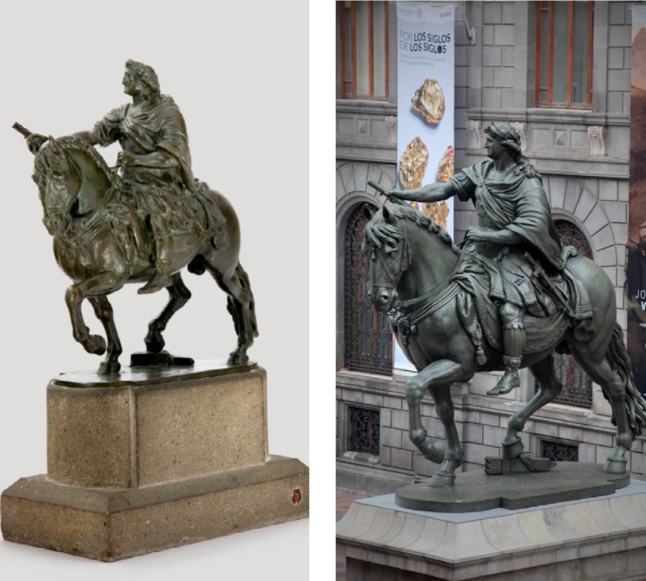 Figura 1 Izquierda. Maqueta para la estatua ecuestre de Carlos IV, ca. 1789-1798. Colección particular exhibida en el Museo Nacional de Arte (Munal). Derecha. El Caballito en junio de 2017, como se ve, su imagen es fiel al proyecto. Ninguna de las dos piezas incluye águila alguna, aunque sí el carcaj.