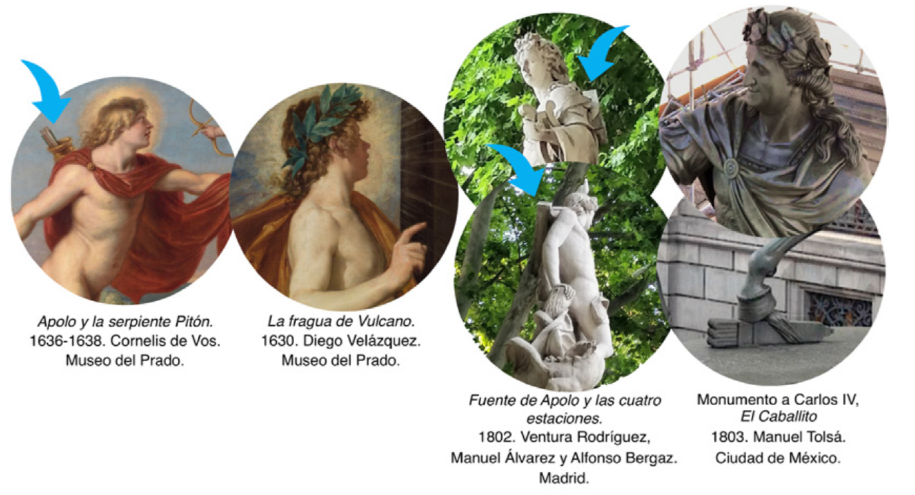 En este mismo clima cultural y estilístico, Apolo fue el motivo central de la fuente encargada por Carlos III como parte del reordenamiento del paseo Del Prado10 en Madrid, que se inauguró en ocasión del matrimonio de quien más tarde fuera el rey Fernando III: La fuente de Apolo o de las cuatro estaciones11 (Navascués, 1982). Esta escultura comparte con El Caballito: gorgonas, laureles y un carcaj, además del manto y el arreglo del cabello. Se realizó al mismo tiempo -entre 1780 y 1802- que Tolsá se formó en la Real Academia de Bellas Artes de San Fernando y también en paralelo a la producción de El Caballito, así que él estuvo al tanto de su diseño.