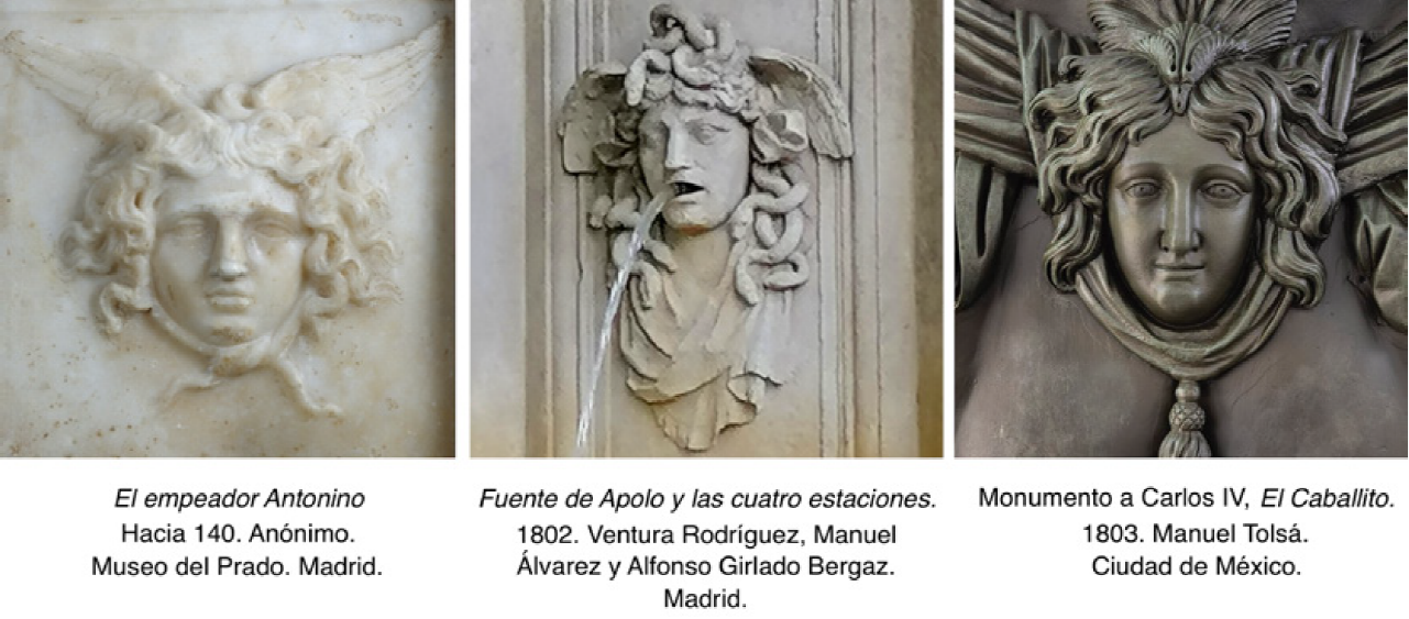 En la Figura 12 pueden verse gorgonas escultóricas en una obra clásica romana y en dos neoclásicas, incluido, por supuesto, a El Caballito.