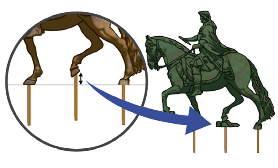 La estabilidad de esculturas ecuestres posteriores5 se resolvió en tres puntos; uno de los cascos delanteros levantado sin un soporte, -como el usado por Donatello-. Para su estatua ecuestre de Enrique IV (1618) -que se ubicó en la Plaza Dauphine, en París, Francia, fue destruida y hoy una copia de 1818 se ubica en el Puente Neuf. Pietro Tacca (1577-1640) osó apoyar al caballo en dos patas, levantando el casco delantero izquierdo y el posterior derecho; pero su mayor alarde fue la escultura de Felipe IV (1640) -escultura que hoy se ubica frente al Palacio Real de Madrid, España-, en la que el caballo tiene las patas delanteras levantadas en postura de levata. Es famosa la historia de que el mismo Galileo ayudó a resolver el equilibrio, al idear con Tacca una estructura interna de hierro en forma de Y que atraviesa la cola y se ancla firme en el pedestal y, además, poniendo la mayor cantidad de peso en la parte posterior al hacer que sus paredes fueran delgadas al frente y mucho más gruesas atrás (Matilla, 1997; Barrio y García 2009, p. 289).