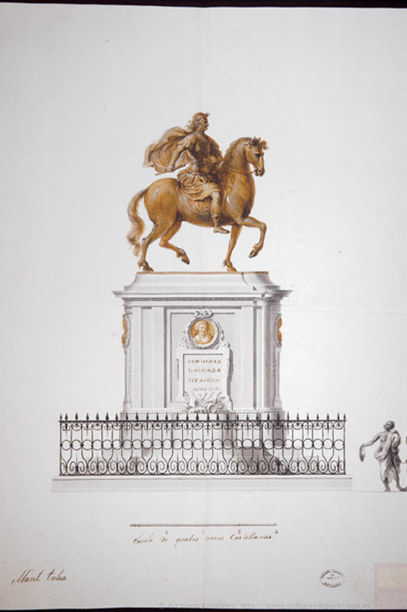 Figura 4 Diseño de la estatua ecuestre y monumento a Carlos IV, proyectado para la Plaza Mayor de México, enviado al rey para su aprobación. En el proyecto original los ornamentos laterales llevarían retratos de la familia real, pero el rey aprobó en su lugar la colocación de representaciones de las cuatro partes del mundo