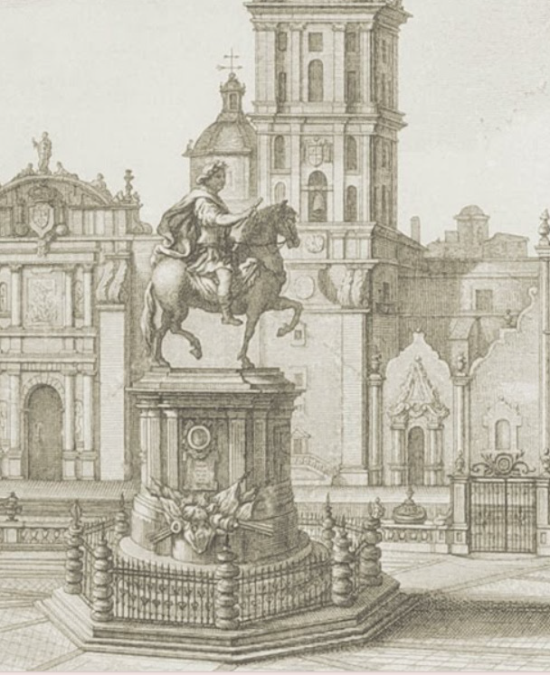 Figura 5 Detalle de Vista de la Plaza de México nuevamente adornada para la estatua equestre de nuestro Augusto Monarca Reynante Carlos IV. No se observa el águila abatida, aunque tampoco el carcaj.