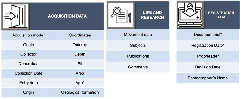 The basic inventory was built using the National Inventory of Museum Cultural Assets (INBCM, Brazil) as a basis. This instrument is discussed in the National Policy on Museums (Ministerio da Cultura, 2003, p. 11; 2007, p. 26) and in the Statute of Museums (Lei nº 11.904, art. 41). In the process of analyzing the documentation of the collection, inconsistent metadata was identified, which did not have a defined function. To address this issue, it was reinterpreted to meet the needs of the collection and to prepare for possible expansion to other Natural History collections. The INBCM, used to periodically add data on cultural assets in Brazilian museums’ collections, has specific elements for the description of scientific objects that were adapted to the new form (Resolução Normativa IBRAM No. 6, 2021, art. 7). This adaptation will allow interoperability at a federal level and ensure the identification, safeguarding, and preservation of the collection, in compliance with the National Policy on Museums.