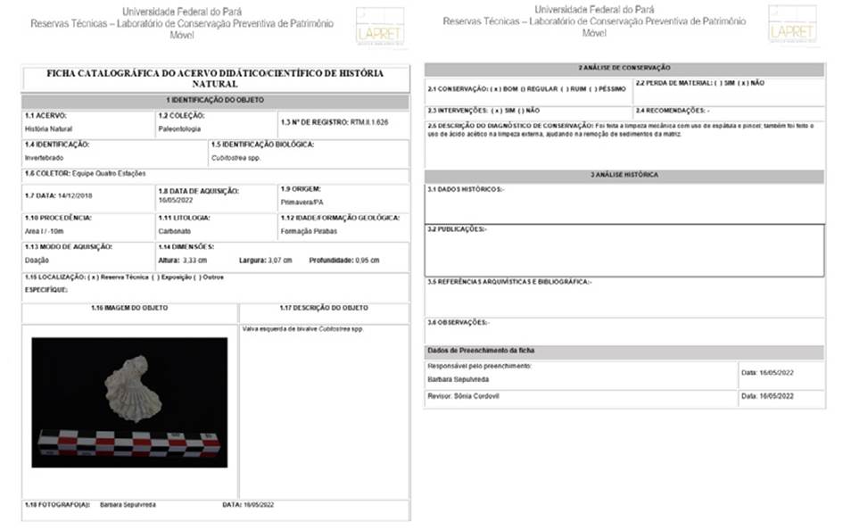 Before 2022, NHC/UFPA assets were registered using two methods. The first was through filling in a registration book with metadata such as biological identifications, place of origin, geological formation, geological age, method of acquisition, and dimensions. The second method was through catalog sheets that were created for each individual item using the Microsoft’s Office Word program. These catalog sheets contained three groups of metadata: identification of the object, conservation, and historical analysis. The identification group contained general information about the scientific asset, such as registration number, identification, date of acquisition and collection, origin, lithology and geological age, acquisition mode, measurements, description of the object, and image. The conservation analysis group contained information about the conditions of the property, such as conservation status, interventions carried out, loss of material, recommendations, and conservation diagnosis. The historical analysis group contained data on the publication of the items in journals, books, and information regarding the removal of museological assets from the collection.