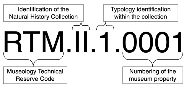 The registration number field serves to identify and control an object within the collection. The NHS/UFPA uses a specific code for their numbering system, which includes information about the storage location, collection typology (paleontology or zoology), and identification sequence. This alphanumerical code provides the collection curator with essential information on the object (Figure 4).