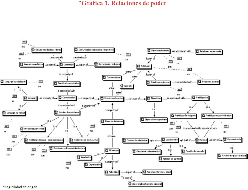 En la estructura relacional articulada en la propiedad de la toma de decisiones, particularmente destaca la importancia de los problemas encontrados; los personales, los epistemológicos, los político-administrativos y de compromiso. Por tanto, respecto de las relaciones de poder, se encuentra que el centro corresponde a la importancia de los conceptos de disposición, comunicación, toma de decisiones y solución de problemas, propiedades estratégicas cuyas dimensiones interrelacionan los significados y las acciones de los actores. En continuidad, la interpretación gráfica de los conceptos que explican la conformación y el funcionamiento de las relaciones de poder en el proceso de DC, quedan representados en la red semántica representada en la gráfica 1.