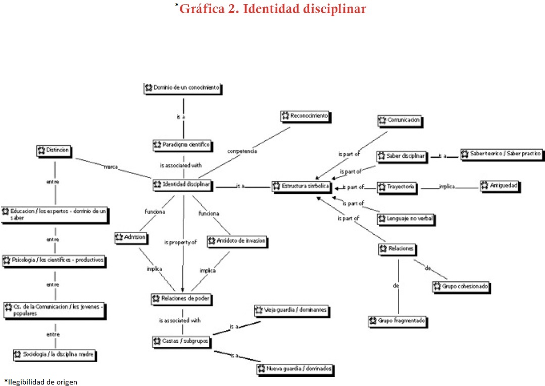 En continuidad, la siguiente red semántica representa, a partir del análisis cualitativo de los discursos proporcionados por los entrevistados, los posicionamientos conceptuales que articularon la construcción y el desarrollo de la categoría de identidad disciplinar (gráfica 2).