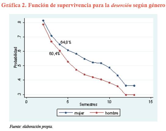 El conjunto de variables relacionado con las características individuales no resultó ser significativo. Al igual que en el análisis previo, aunque las probabilidades de sobrevivir de los hombres son menores que las de las mujeres, estas diferencias no son significativas. Ser hombre o mujer no representa una diferencia en el riesgo de desertar, a pesar de que en la mayoría de la literatura empírica se encuentre que el hombre es menos persistente que las mujeres en su trayectoria universitaria.