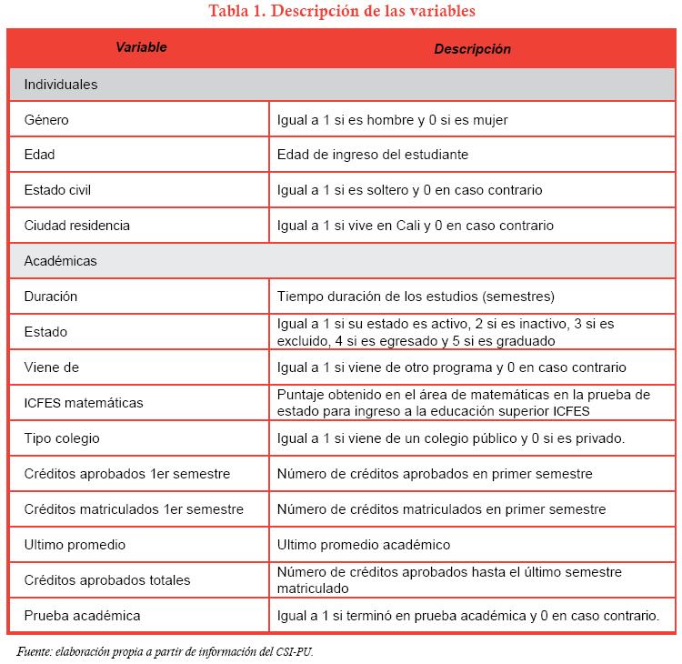 De acuerdo con la revisión de la literatura, los factores que afectan a la deserción/graduación de un estudiante en la universidad se pueden clasificar, principalmente, en cuatro grupos: variables relacionadas con las características individuales del estudiante; variables relacionadas con su situación académica; variables institucionales, y variables socioeconómicas. Dada la disponibilidad de la información, las variables utilizadas para el análisis se agrupan en académicas e individuales (véase tabla 1).